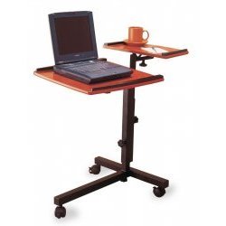 This mobile laptop desk also allows you to move it to any room you like. Start your work in your office then move the desk and your computer into the family room! Constructed from pressboard and laminate with a metal leg for support and three casters for easy mobility. This laptop desk is available with a Maple or Cherry finish, Assembly level/degree of difficulty: Easy.