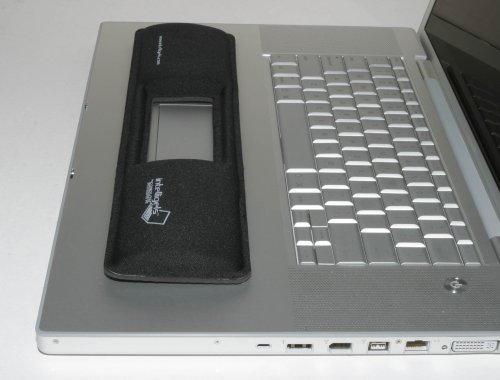 NEW! *PATENTED* wrist rest designed specifically for LAPTOPS! WHAT YOU HAVE BEEN LOOKING FOR - Intelligels® Lycra nylon SoftFoam laptop/notebook (and PC DESKTOP KEYBOARDS) wrist rest designed for laptops to place hands in correct position to reduce wrist strain and add comfort to hands from hot, hard laptop computer cases! Works with integrated touch pads and click buttons! Perfect for Apple® and most laptops 14" - 17" screens!