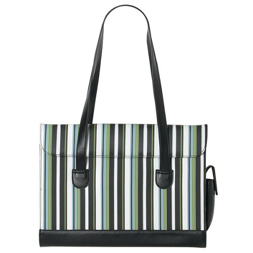 With its crisp stripes of blue, green, black and white, this Merona flap-top tote is as stylish as it is smart. The durable nylon shell is structured to be sturdy, offset by black faux-leather accents and lined inside with a padded layer of white quilting. The flap stays put with easy-close fasteners, while a pair of comfy straps let you wear this case over your shoulder or on your arm. The exterior boasts 1 wide pocket and a side pouch for your cell phone. Nylon. Imported. 11-1/4Lx15-1/4Wx3-1/4D".